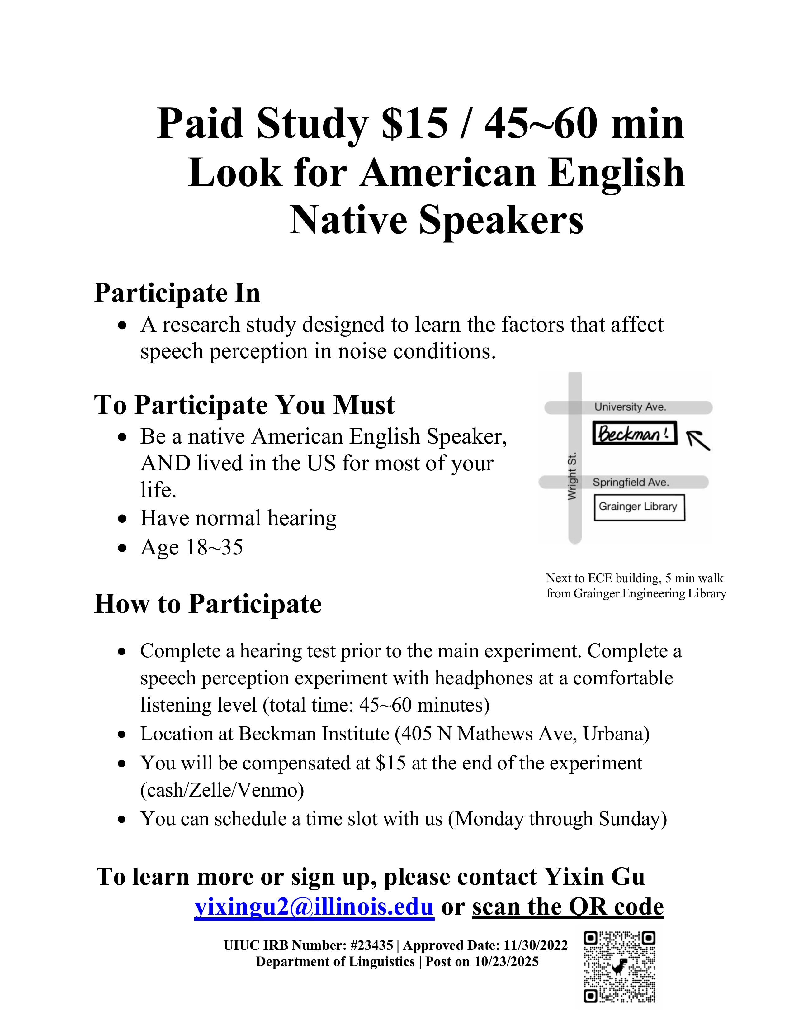 Description: We’re recruiting native American English speakers who age 18-35 with normal hearing for a study on speech perception in noise. The session includes a brief hearing check, short questionnaires, and a headphone-based listening task. Total time is about 60 minutes and participants receive $15 upon completion (cash/Zelle/Venmo). Sessions are held in-person at the Beckman Institute Room 2412 (405 N Mathews Ave, Urbana).